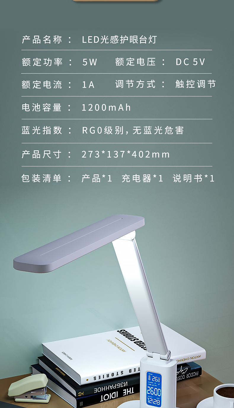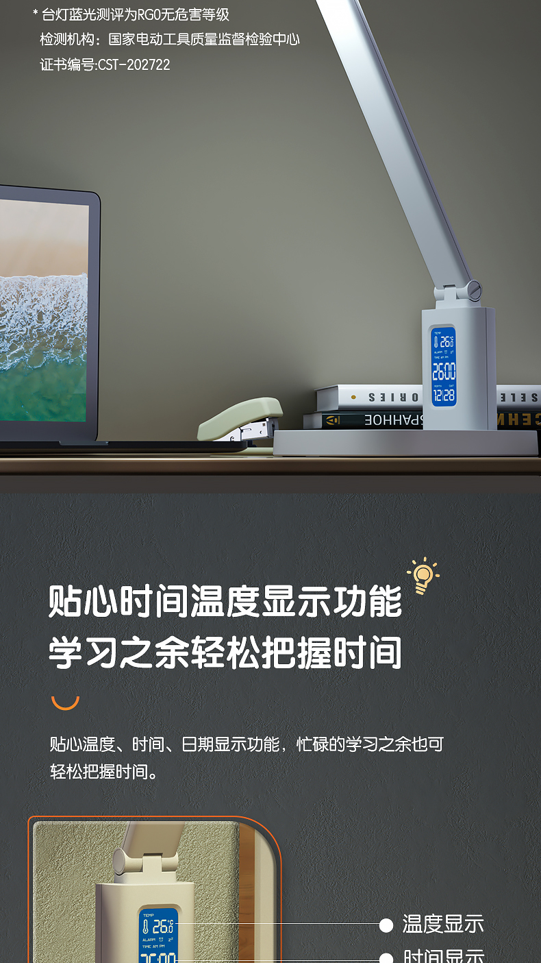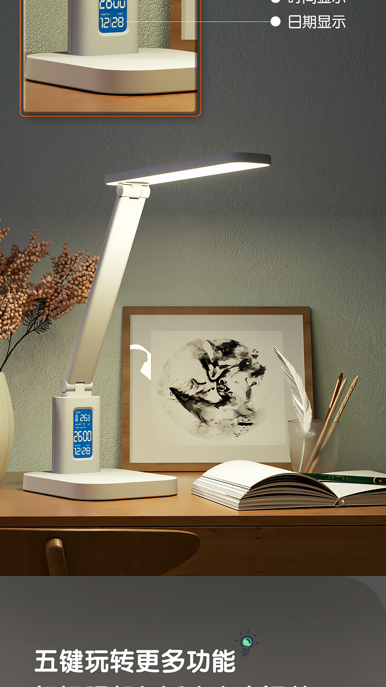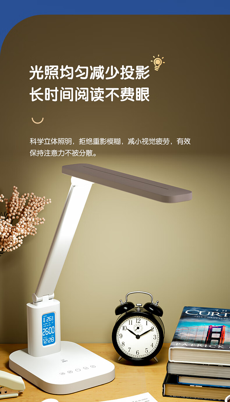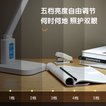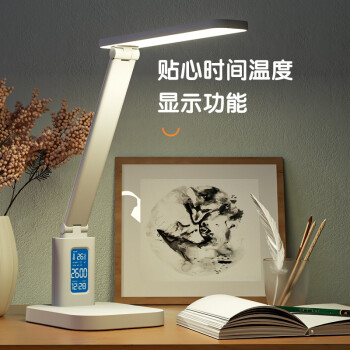 得力/deli 17859 臺燈/壁燈/床頭燈/落地?zé)?LED折疊臺燈 時間溫度日期同屏顯示帶鬧鐘 RG0級減藍(lán)光 床頭宿舍書桌工作臺燈