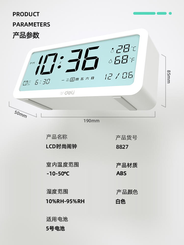 得力/deli 8827 座鐘 多功能電子鬧鐘學(xué)生用臥室床頭簡約智能溫濕度計(jì)桌面夜光靜音數(shù)字智能時(shí)鐘表 大號白色【192*88*50mm】