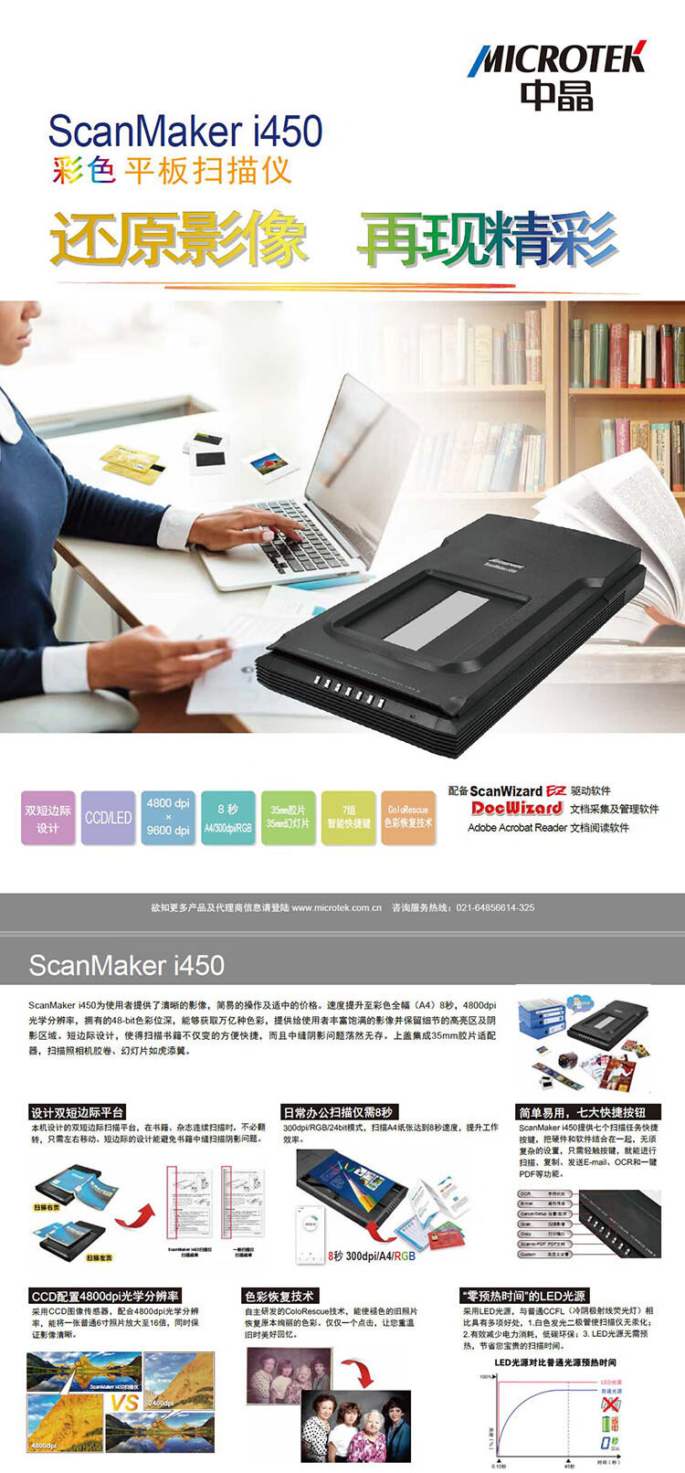 中晶(MICROTEK)ScanMaker i450 A4彩色CCD平板掃描儀 4800dpi×9600dpi 圖文底片辦公商用家用掃描儀
