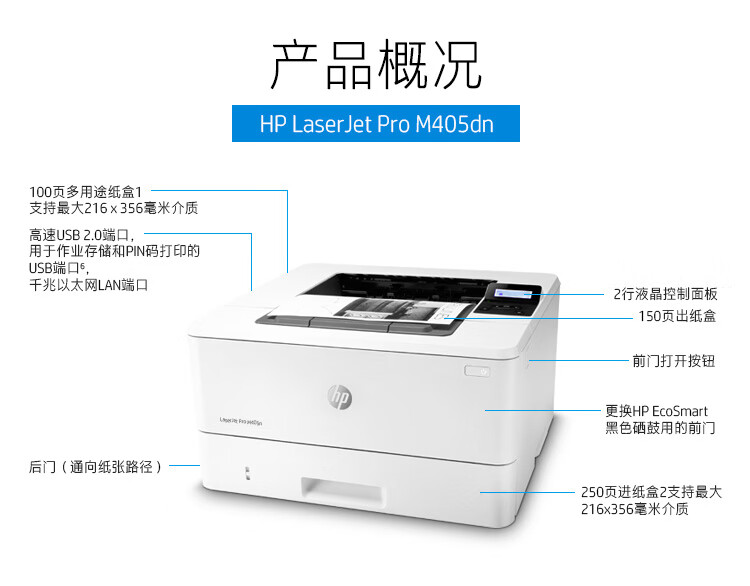 惠普/HP M405n A4 黑白打印機(jī) 級(jí)激光打印機(jī) 液晶顯示屏 有線網(wǎng)絡(luò)連接
