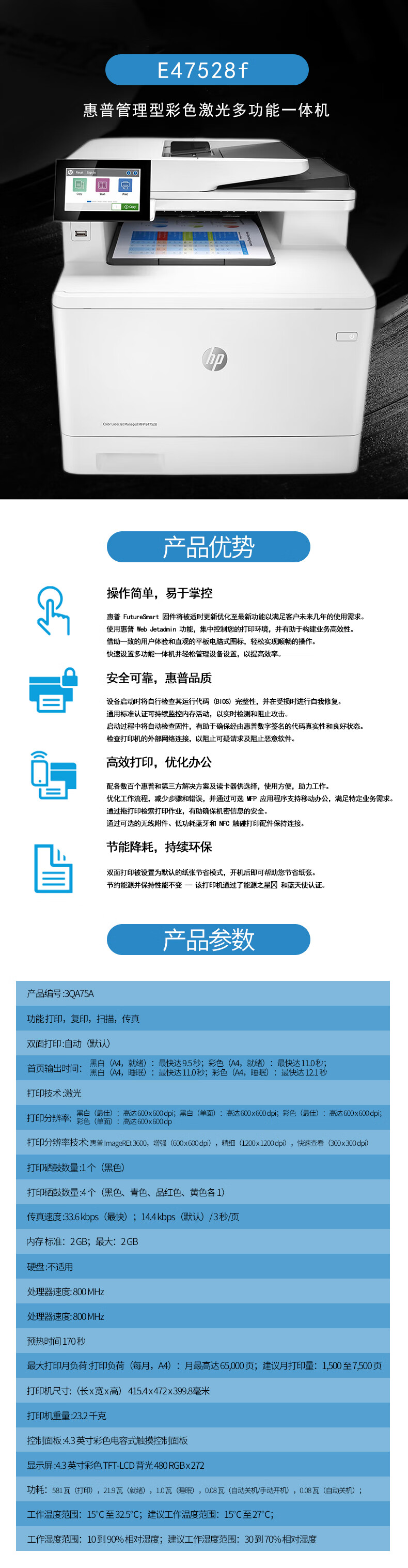 惠普(HP)E47528f A4幅面彩色激光自動(dòng)雙面打印掃描復(fù)印傳真多功能一體機(jī)