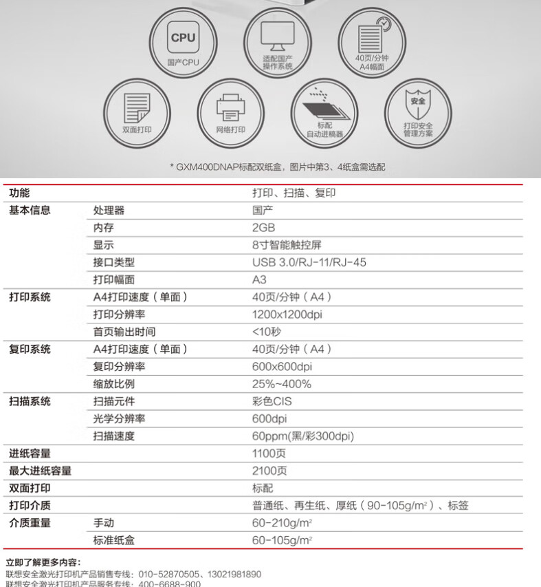 聯(lián)想(Lenovo)GXM400DNAP A3黑白多功能(打印/復印/掃描)40ppm/雙面打印/網(wǎng)絡打印/自動輸稿器(國產(chǎn)化)