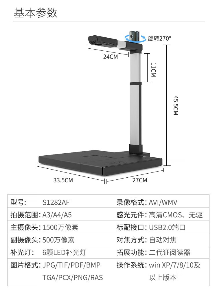 良田/eloam S1282AF 高拍儀 高拍儀掃描儀雙攝像頭金融銀行專用人臉采集1500萬像素A3幅面 帶身份讀卡器+指紋識別