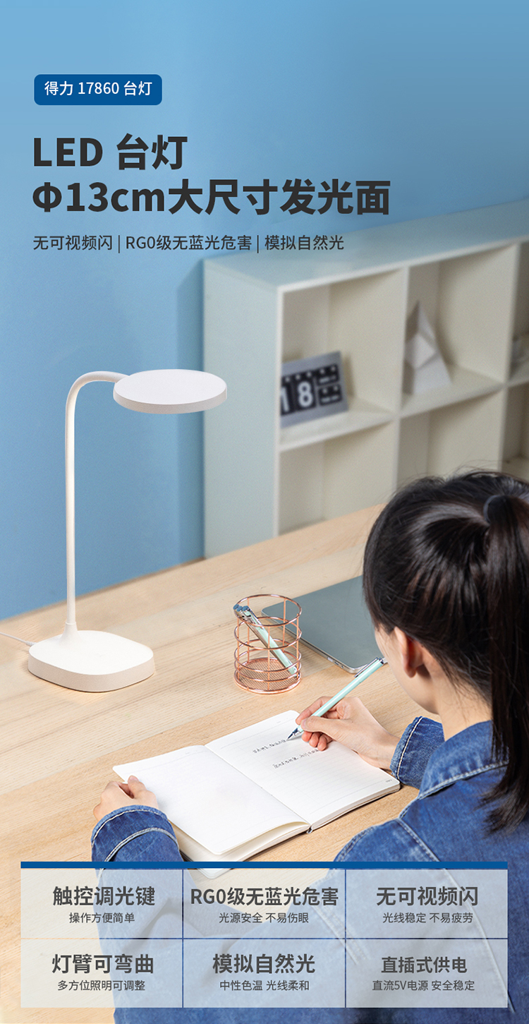 得力(deli)LED燈無藍(lán)光臺燈 無極調(diào)光辦公學(xué)習(xí)夜燈 直插式17860
